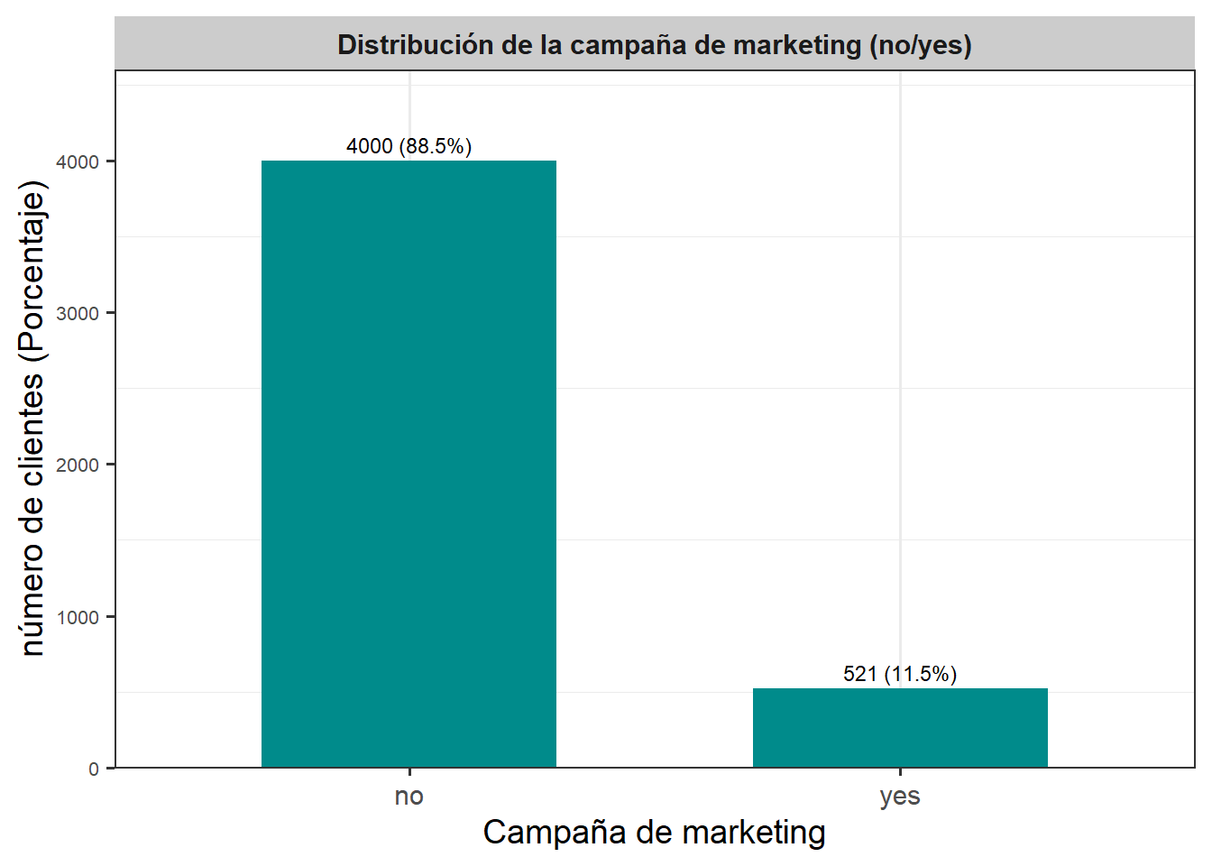 En cuanto al estado civil (marital), la mayoría de los clientes están casados (\(61.87\%\)), seguidos por solteros (\(26.45\%\)) y divorciados (\(11.68\%\)), lo que sugiere una base de datos predominantemente compuesta por personas con vínculos conyugales estables. Respecto al nivel educativo (education), más de la mitad de los clientes tiene educación secundaria (\(51.01\%\)), mientras que el \(29.86\%\) alcanzó estudios terciarios y el \(15.00\%\) solo nivel primario. Un pequeño porcentaje (\(4.14\%\)) no reporta su nivel educativo. Estos datos permiten identificar patrones demográficos que podrían ser relevantes para el diseño de estrategias de marketing más efectivas según el perfil del cliente.