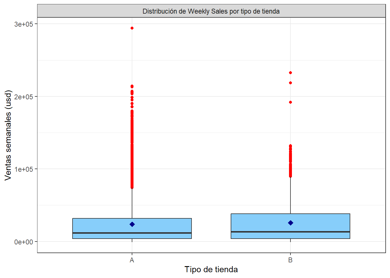 El conjunto de datos completos lo puede encontrar este link. Trabajaremos un subconjunto de datos contiene las ventas semanales en dolares, cada tienda tiene un número de identificación y un tipo de tienda específico, las ventas estan separadas por ID de departamento. Junto con las ventas hay variables como si fue de vacaciones o no, la temperatura media durante la semana en esa localidad, el tiempo medio del combustible en dolares por litro esa semana y la tasa de desempleo de esa semana.