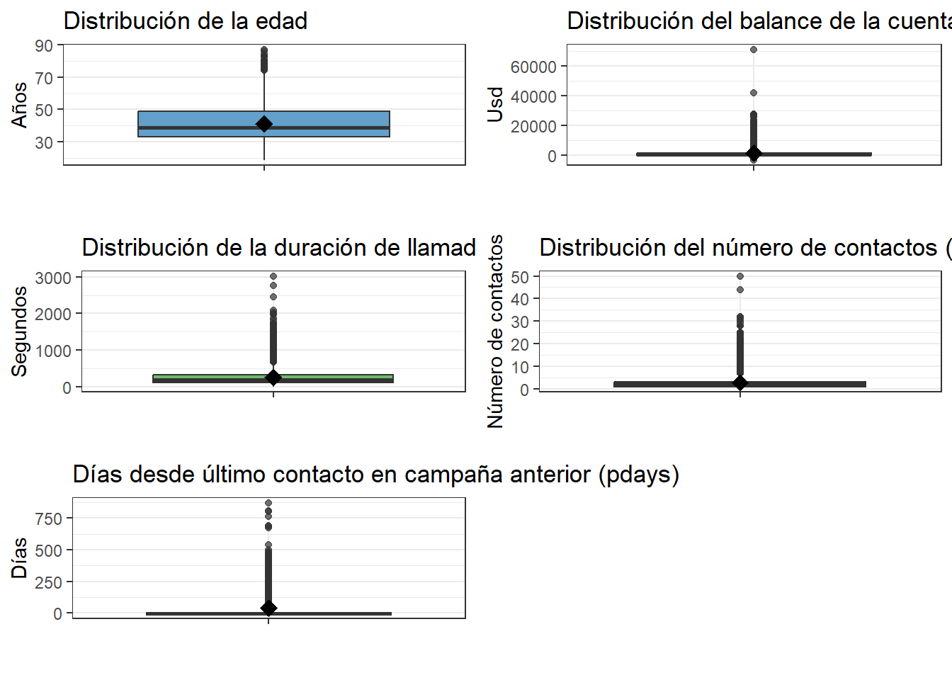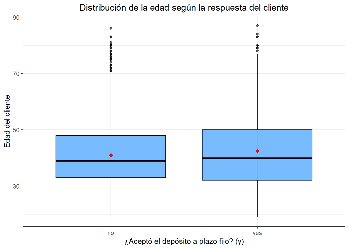 El grafico muestra la distribución de la edad de los clientes según su respuesta a la campaña de marketing, diferenciando entre quienes no aceptaron (no) y quienes sí aceptaron (yes) contratar un depósito a plazo fijo. Ambas gráficos muestran un comportamiento similar, donde el \(50\%\) de los clientes alrededor de los 40 años o menos en ambos casos. Tambien, se observa que los clientes que aceptaron la oferta tienden a tener un promedio ligeramente superior en comparación con quienes no aceptaron. Esto podría indicar que los clientes de mayor edad muestran una leve mayor disposición a aceptar el producto. En resumen, aunque hay una leve diferencia por edad, esta variable por sí sola no parece explicar completamente la decisión de aceptar el producto.
