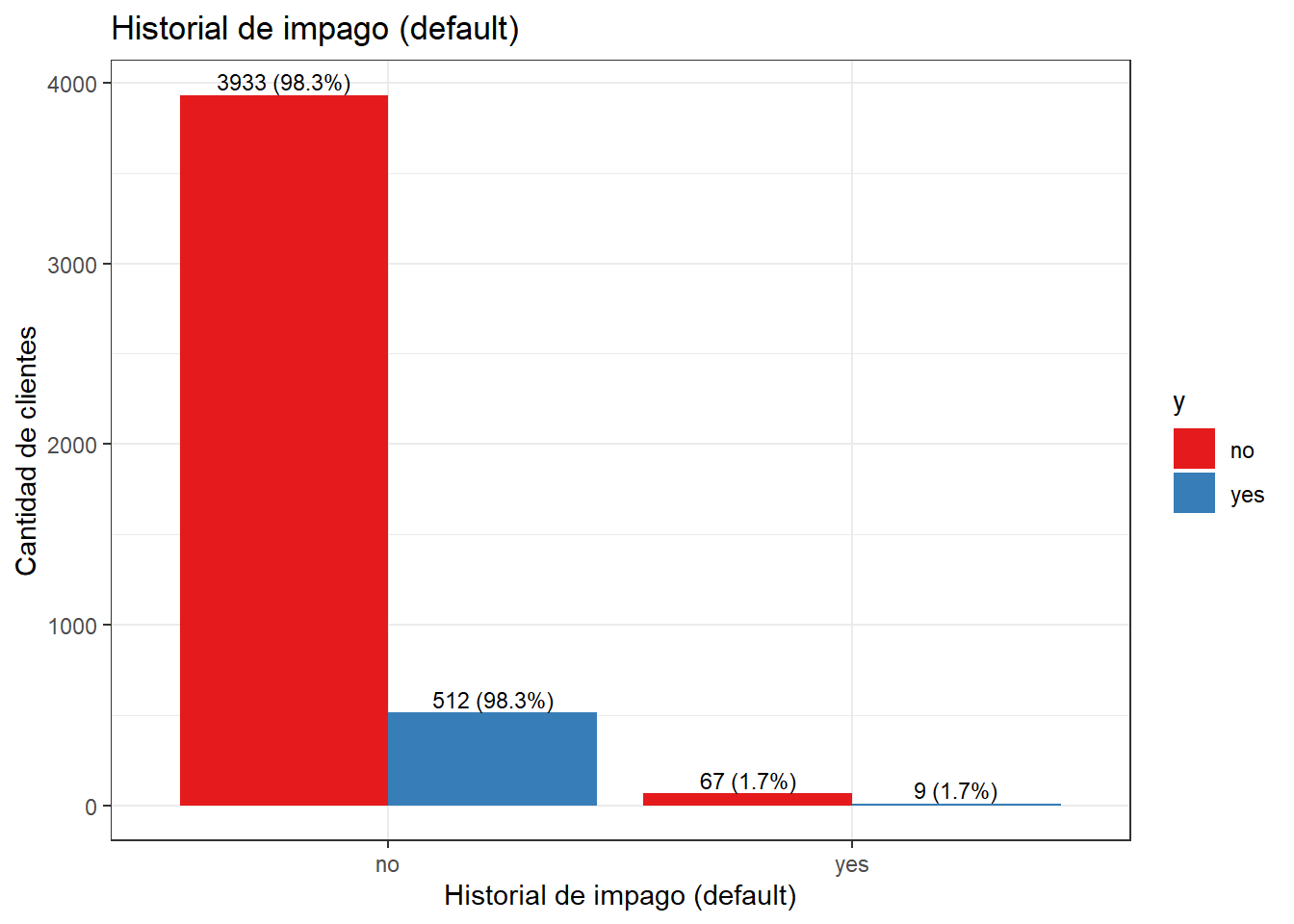 La gráfica muestra la distribución de la variable default, que indica si un cliente tiene o no un crédito en incumplimiento de pago. Se observa que el \(98.3\%\) de los clientes (\(4445\) personas) no tienen incumplimientos, mientras que solo el \(1.7\%\) (\(76\) personas) sí presentan incumplimientos. Esta marcada desproporción sugiere que la mayoría de los clientes se encuentran al día con sus compromisos financieros, y que el incumplimiento es un evento poco frecuente en la base de datos.